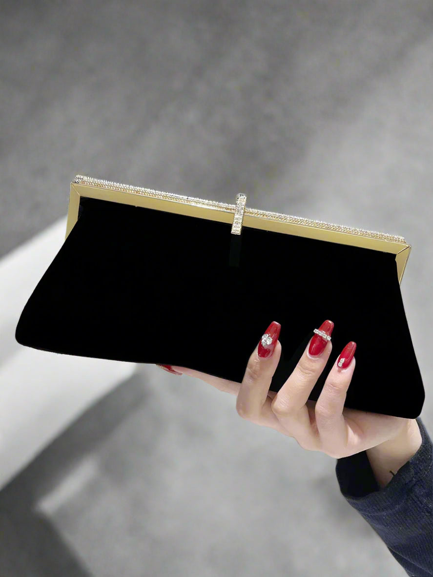 Elevate your evening look with this chic black velvet clutch, featuring luxurious gold accents and a sleek design. Perfect for formal events or special nights out, it adds a touch of sophistication and timeless elegance to any outfit.